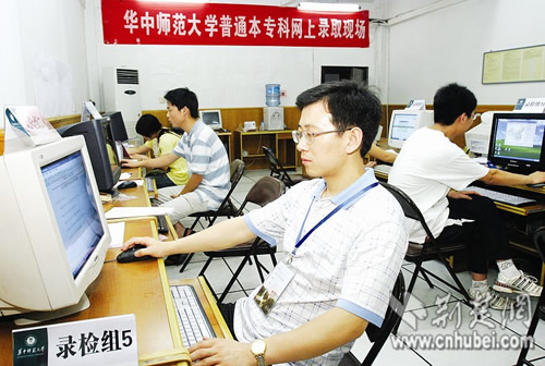 今年在全國高校中,華中師范大學(xué)是唯一一所所有專業(yè)均在湖北提前批次錄取的高校。昨晚9時(shí),記者在華中師范大學(xué)2008年高招錄取現(xiàn)場(chǎng)看到,該校數(shù)臺(tái)高招錄取專用電腦已全部就位,多名招生人員正緊張地守在錄取電腦前,進(jìn)行接收投檔前的各項(xiàng)準(zhǔn)備工作。