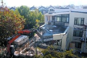 昨日,亦莊一棟洋房社區(qū)內(nèi)一棟別墅的違建部分被城管部門強拆。本報記者 吳江 攝