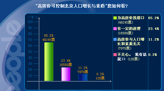 截止到14日晚21時(shí),參與調(diào)查的網(wǎng)民共計(jì)70938人,其中有46245人認(rèn)為這是在為高房價(jià)找借口,直接質(zhì)疑任志強(qiáng)的“素質(zhì)”,持此一觀點(diǎn)的網(wǎng)民占總?cè)藬?shù)的比例高達(dá)65.2%。此外另有11.2%的人也明確表示房價(jià)與人口增長和素質(zhì)無關(guān)。不過,也有近四分之一的網(wǎng)民認(rèn)為任志強(qiáng)的說法"有一定道理"。