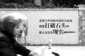 日前,讀者吳先生打進本報熱線稱,他在南岸一新建小區(qū)外看到了這樣一條標語,讓他很費解,他不知道開發(fā)商打出這條廣告宣傳語是什么意思?吳先生說,這句宣傳語這樣寫道:“難道全世界的雞蛋聯(lián)合起來,就能打破石頭嗎?做人還是要現(xiàn)實些!