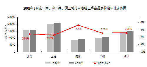從圖表中的數據可以看出,2009年8月京、津、滬、穗、深五大城市的中高檔二手房價格均呈上漲走勢。在上述五大城市中,8月份中高檔二手房上海和北京分別上漲2.58%和2.93%?傮w來看,2009年8月五大城市中高檔二手商品房在市場成交活躍的促進作用下,價格再創(chuàng)新高。價格上漲最明顯的依然是天津,上漲了5.3%。其次是深圳和廣州,分別上漲3.25%和3.15%。