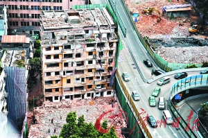 昨天下午,在東濠涌高架橋東側(cè)的圍蔽區(qū)內(nèi),錢路頭后街15號、18號兩棟樓早已完成拆遷,等待拆除。15號是一棟八層住宅樓,西側(cè)幾乎與高架橋“臉貼臉”?删驮诰嚯x高架橋幾米處,兩道幾十厘米寬的裂縫從樓頂直灌而下,裂縫中間只有數(shù)根鋼筋相連。從對面高樓往下望,筆直的裂縫直通地面,就好像用斧子劈開的一樣。