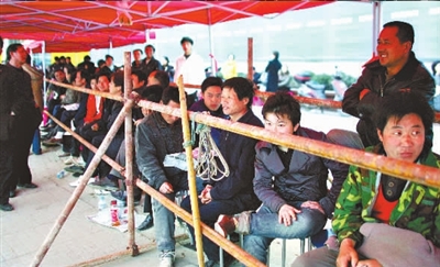 記者詢問幾位排隊(duì)的農(nóng)民工:“你們排隊(duì)拿號(hào)是自己買房嗎?”他們說,是受買房人之托排隊(duì)拿號(hào)的。排隊(duì)—天—夜可以拿到300元的辛苦費(fèi)。由于要熬—通宵,所以都穿上了厚厚的夾衣。( 記者梁超)