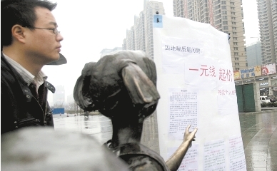 昨日10時,在金水路與未來路交叉口,一男子拿著一個上寫“因地暖質(zhì)量問題,一元錢拍賣個人房產(chǎn)”字樣的牌子站在雨中,引來不少市民觀看。