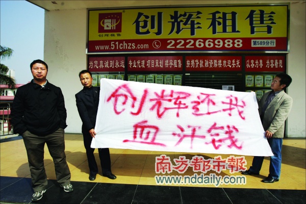 近20位客戶聞?dòng)嵹s到創(chuàng)輝租售水云軒中山總店追討欠款。店員的統(tǒng)一答復(fù)是“追討欠款的業(yè)主請(qǐng)到深圳總部查詢”。該公司一名陳姓置業(yè)顧問表示,“我們最多虧一個(gè)月的工資,還承受得了。最慘的是客戶,有的人怕是一輩子攢下的錢都難指望了!