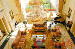 推開這座四層、總面積近2000平方米的意大利文藝復(fù)興時期風(fēng)格別墅的雙面大門,奢華之氣撲面而來。這個近200平方米的客廳里靠近陽臺一側(cè)擺放著價格堪比頂級賽車的鋼琴,價值398萬元。