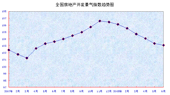 中新網(wǎng)7月18日電 據(jù)國家統(tǒng)計局網(wǎng)站消息,6月份,“國房景氣指數(shù)”為103.08,比5月份回落0.26點,比去年同月回落0.55點。