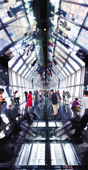 再轉(zhuǎn)乘專用電梯,終于來到位于100層、距地面474米處的“觀光天閣100”。這是目前世界最高的觀光設(shè)施。55米長的懸空觀光長廊,其實(shí)就是大廈頂部倒梯形風(fēng)洞的上檐,三角形屋頂鑲滿玻璃鏡面,光影折射夢(mèng)幻迷離。長廊地面鋪有3條透明玻璃地板,可直接俯瞰腳底下陸家嘴金融貿(mào)易區(qū)川流不息的車流、芳草如茵的綠地及連綿的樓宇,對(duì)膽量是一種小小的考驗(yàn)?zāi)!難怪在轉(zhuǎn)乘電梯時(shí),顯示屏播放的內(nèi)容為:玻璃地板的安全性能。