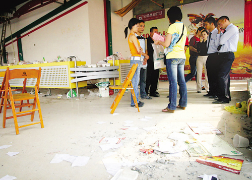 從當(dāng)日上午10時至下午2時,不少業(yè)主聚集在售樓部內(nèi),要求開發(fā)商給個明確答復(fù),一直未能如愿。一些業(yè)主撕碎了文件,甚至把售樓部的椅子扔到門外。為此,轄區(qū)民警曾兩度趕到現(xiàn)場維持秩序。