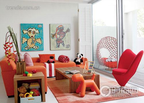 紅色跟橘色作為主調(diào)并不是很容易把握的,因?yàn)榇竺娣e此類顏色的使用容易使人感到煩躁,而這間客廳的搭配卻恰到好處。墻壁摒棄了花色的壁紙,保留純白的底色,只掛了兩幅充滿稚拙童趣的畫作,并以簡(jiǎn)潔明快的天藍(lán)色打破視野中紅色占據(jù)的僵局。地板也做了簡(jiǎn)單處理,只鋪一塊淺淡的扎染效果的地毯,絕不喧賓奪主。