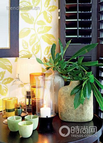 整幅畫面中最為濃重的一筆當(dāng)屬貼近窗邊的角落,一樣是深色圓茶幾,上面擺放的花瓶十分古樸,插花也顯得更為隨性和張揚。蠟燭不再是單一的白色,茶綠色的三杯小蠟自成一體,身后還藏著黃色的蠟燭與玻璃器皿。