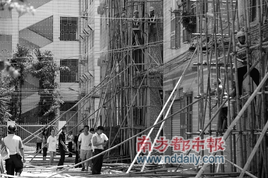 昨日中午11時30分,記者再次到達(dá)現(xiàn)場,秀新(即埔廈新村)1巷、2巷、3巷、4巷、5巷等地,還有數(shù)棟樓房外搭有腳手架,木板、鋼筋散落一邊。橫崗街道執(zhí)法隊正在拆除一棟樓房的腳手架。龍崗區(qū)城市管理局副局長兼查違辦主任何永華在一旁督戰(zhàn)。