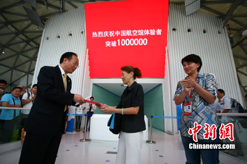 中新網(wǎng)上海8月10日電(記者 陳婷婷)10日,上海世博會中國航空館參觀體驗總?cè)藬?shù)突破百萬大關。來自上海寶山區(qū)的陳惠珉女士成為第100萬名幸運體驗者。世博局浦西DE片區(qū)部陳超部長親臨現(xiàn)場向中國航空館迎來第100萬體驗者表示祝賀。中國航空館館長周俊向陳惠珉女士贈送了“中國航空館第100萬幸運體驗者”榮譽證書,以及豐厚且具有航空特色的獎品。