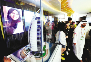 沿著時光隧道般的過道,古老的阿聯酋慢慢展現在參觀者眼前。阿聯酋的大學生志愿者們穿著傳統(tǒng)的服飾向游人問好,仿佛來自遠古的駝鈴聲回蕩在耳邊。移步換景,在現代館內,參觀者恍如換了個世界,看到的是利用視聽技術營造的現代阿聯酋,它有著快速發(fā)展的城市環(huán)境,有讓世界矚目的建筑和風景,還有豐富多彩的時尚文化。
