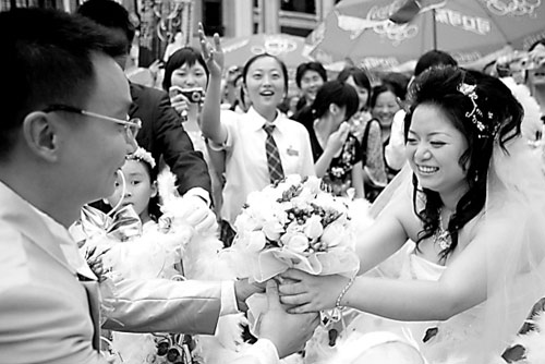 儀式中,上海世博會志愿者服務站破例來校為新人們現(xiàn)場登記,8位新人婚禮當天完成一樁心愿———光榮加入上海世博會志愿者隊伍。(彭薇 陳煥聯(lián))