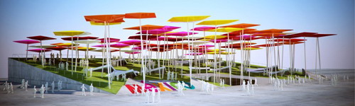 風箏廣場是墨西哥館的核心。風箏在nahuatl語(民族方言)的名稱是“papalotl”,也就是西班牙語中的蝴蝶。風箏是連接墨西哥文化和中國文化的一個要素。參觀者可以在墨西哥館里購買風箏,或者親手做一個風箏,然后在風箏廣場上放飛。由風箏組成的森林代表著墨西哥人對未來的期待,廣場上的人造綠草表達了墨西哥人對城市綠地的關注。人們可以在綠地上進行各種活動,諸如讀書、野餐或是在陰涼處隨意地休憩;綠地上空,風箏在飛翔。