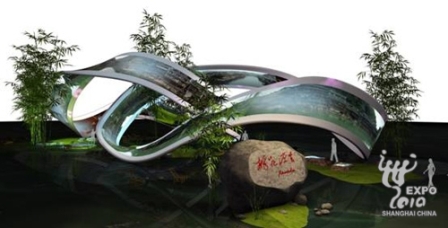 湖南館取名為“桃花源里·Xanadu”——Xanadu英文意為“世外桃源”,是西方世界描述神秘仙境時最廣泛使用的詞。湖南館的展示主題是“都市桃花源”。展館外觀之所以采用雙“魔比思環(huán)”相扣的造型,是取義無窮大符號“∞”和中國太極,這與和諧自然的中國理想城市意境以及長株潭城市群“兩型社會”的理念相契合。“魔比思環(huán)”是雙環(huán)環(huán)繞,就單環(huán)而言展開長度達(dá)100米,高3米,只有一個面和一個邊界。由于主體造型是不規(guī)則的建筑環(huán)體,對施工和投影都帶來了重大挑戰(zhàn)。