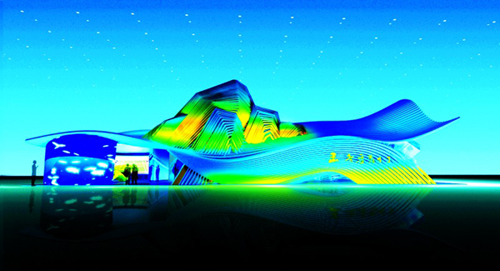 記者在現(xiàn)場(chǎng)看到,盡管尚需細(xì)化,但剛剛誕生的山東館已顯示出不凡魅力。展館占地600平方米,最高處約9米,以藍(lán)色為主色調(diào),突破了以往展館四墻合圍的方正常規(guī),外觀將大海的浪涌和雄峙的泰山融為一體,流暢的曲線勾勒出山東“海岱交融”的地理形勝,表達(dá)出“青山連綿不絕,綠水長(zhǎng)流不斷”的文化意境。