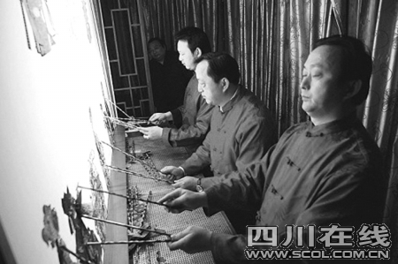 “王皮影”在閬中寶臺鄉(xiāng)享譽頗高,王彪的爺爺、皮影大師王文坤是“王皮影”的代表。川北皮影藝人取土皮影和廣皮影之長,融入川戲服飾創(chuàng)造出一種獨具特色的皮影。王彪已是“王皮影”的第七代傳人了,他們從小就跟著爺爺走村串巷,四處演出!耙豢跀⒄f千古事,雙手對舞百萬兵。”1988年,王文坤曾受邀到奧地利維也納金色大廳演出;2009年春節(jié),王氏兄弟受邀到美國表演皮影戲,爺孫倆同赴海外表演,在川北當?shù)貍鳛榧言挕?/p>