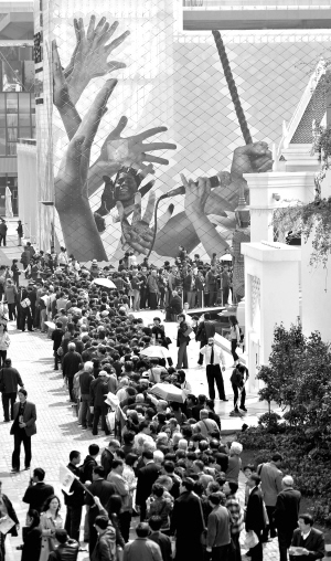 拿到中國館預(yù)約券的游客欣喜,沒拿到的也十分平和。錢先生夫婦9時45分入園時,中國館預(yù)約券已發(fā)放完畢,他們就在亞洲廣場上的預(yù)約機(jī)上預(yù)約了主題館的參觀!爸袊^反正是永久性建筑,以后再來看也不遲,”同樣未能拿到預(yù)約券的李先生告訴記者。