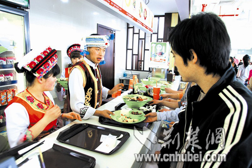 作為普通游客,我們還是首選中美食街。美食街大樓共兩層,呈L形,多是各地名小吃和中西簡餐。操作程序與武漢的各大美食廣場如出一轍:收銀窗口買卡充值,再持卡到各窗口“刷”,吃完后退卡退押金。價格比武漢稍貴,約20元-40元即可搞定。