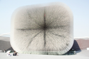 記者:我現(xiàn)在就在英國(guó)館外大概50米左右的地方,英國(guó)館占地6千平方米,是最大的自建館之一,在英國(guó)館的入口處外墻上印了這么一句話,“英國(guó)館就是英國(guó)送給中國(guó)的禮物”。為什么這么說呢,因?yàn)檎挠?guó)館的外墻就像一個(gè)剛剛打開的精致禮品包裝盒,種子圣殿就是禮物本身,在外面的露天廣場(chǎng)則是剛剛?cè)¢_的包裝紙,游客們可以在上面休息,孩子們可以在上面嬉戲。