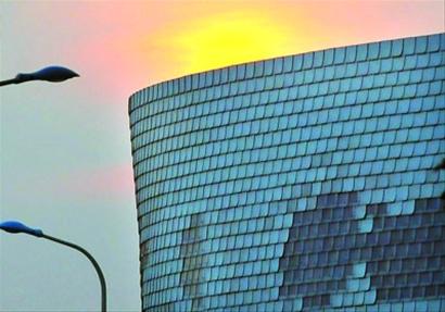 為什么帷幕能發(fā)電?原因就來自于帷幕上掛著的那1萬個(gè)“小太陽”,每個(gè)“小太陽”都有1塊內(nèi)嵌太陽能智能電池板,可以吸收光能而發(fā)出閃光。據(jù)介紹,這些小太陽的學(xué)名是聚碳酸酯板,每個(gè)20厘米見方,包括一個(gè)能量發(fā)生器、一個(gè)存儲(chǔ)介質(zhì)和一個(gè)LED形式的電力負(fù)載。吸收太陽光后,產(chǎn)生的能量可以轉(zhuǎn)換為白色燈光。在游客的照相機(jī)閃光燈閃亮?xí)r,“小太陽”便會(huì)回閃,如同在對(duì)你眨眼睛一般。隨之,它周圍的“鄰居”在感知?jiǎng)屿o后,形成“多米諾效應(yīng)”,整個(gè)外墻就會(huì)閃成一片紅色光海。值得一提的是,1萬個(gè)“小太陽”白天在吸收太陽能和其他光能后,晚上就能為展館燈光供電。