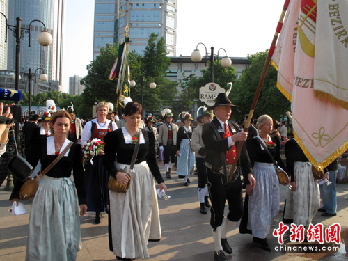 中新網(wǎng)南京5月23日電(申冉 閆正偉)今天下午,南京市中心山西路的市民廣場上空飄蕩著來自奧地利美麗山崗原野間的優(yōu)美圓舞曲,穿著奧地利民族服裝的奧地利施瓦茨市長樂團(tuán)樂手們帶著他們淳樸悠揚(yáng)的旋律和歡快自由的舞步,給南京市民送來了一個(gè)充滿著奧地利音樂狂歡節(jié)日氣氛的初夏周末。