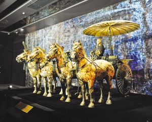 秦俑館銅車馬共兩乘,此次在中國館展出的“一號銅車馬”為雙輪、單轅、駟馬系駕,總重約1061公斤。主體為青銅所鑄,通體飾有精美彩繪,配有1000多件金銀配飾。“一號銅車馬”在中國館“國之瑰寶”展區(qū)展出,展示將持續(xù)到世博會閉幕。