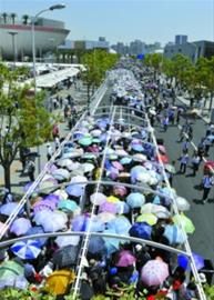 當(dāng)記者沿著世博軸緩步來(lái)到博成路高架步道下方的沙特館排隊(duì)區(qū)域入口時(shí),時(shí)間已是9:25。入口處的沙特館工作人員手上的告示牌已經(jīng)寫(xiě)著“沙特館排隊(duì)時(shí)間約8小時(shí)”,不少游客看到標(biāo)示后就放棄了排隊(duì),但更多的游客選擇繼續(xù)堅(jiān)持。已經(jīng)73歲的付老先生說(shuō):“之前就選定傳聞中很好看,但排隊(duì)時(shí)間長(zhǎng)的沙特館作為世博游第一站,下定決心要把最難排到的場(chǎng)館先看掉。”老人事前已準(zhǔn)備好遮陽(yáng)帽、攜帶式小椅、食物和水等物品,即使真要排9小時(shí)也要堅(jiān)持下去。