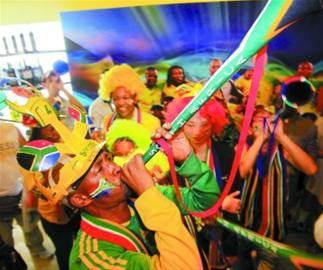 雖然開幕式要到20∶00才開始,但在19∶00不到的時(shí)候,南非館的門口和館內(nèi)就已經(jīng)喧鬧無比,受邀參加南非館世界杯開幕慶典的嘉賓,幾乎人手一個(gè)VUVUZELA,頭戴“馬卡若卡”(一種南非特色帽子,外觀像足球)。南非球迷的脖子上還掛著印有南非國(guó)旗的圍巾,臉上或手臂上也彩繪著南非國(guó)旗。