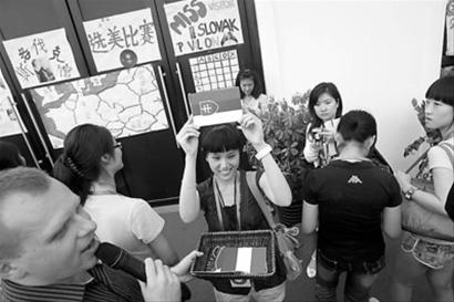 昨天下午2點, 18名在斯洛伐克館等待入場的美女被邀請參加“女士之日”的選美大賽,比賽共分為兩個環(huán)節(jié),包括有關(guān)世博和斯洛伐克的問答,以及才藝表演。在決賽環(huán)節(jié),三位女士同時學(xué)唱一首斯洛伐克兒歌,現(xiàn)場的觀眾則成為決賽評委。最終,來自上海徐匯區(qū)的護(hù)士小姐沈瑾脫穎而出,獲得 “斯洛伐克館小姐”的榮譽稱號,她的大幅照片還將被掛在斯洛伐克館的貴賓廳。除了來自斯洛伐克館的眾多禮遇,她還能選擇多個熱門場館,直接從VIP通道入內(nèi)參觀。