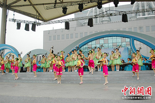 齊奏《豐收鑼鼓》喜慶十足,琵琶表演唱《采蘑菇的小姑娘》活潑可愛,二胡演奏《賽馬》粗獷奔放,間或穿插笛聲嘹亮……半個小時的演出中,小演員們將中國傳統(tǒng)民樂之美表現(xiàn)的酣暢淋漓。臺下觀眾頻頻按下快門,不時傳來陣陣喝彩聲。在接下來的一天時間,他們將為世博觀眾獻上三場精彩表演。