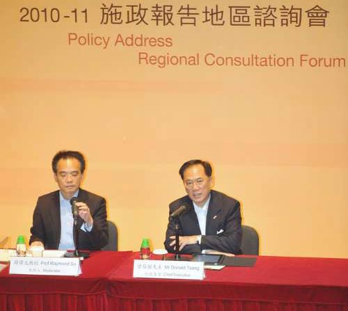 特區(qū)政府已分批約見多個政黨和團(tuán)體,咨詢市民對施政報告的意見。首場咨詢會在科學(xué)館舉行,約有來自各區(qū)200名市民出席,但只有十多人向曾蔭權(quán)提問,大部人均關(guān)注民生議題,包括復(fù)建居屋的訴求。曾蔭權(quán)在開場白中表示,希望透過咨詢會聆聽大家在生活、學(xué)習(xí)、就業(yè)、營商等各方面的意見、憂慮和建議。他將在一周后動筆,希望在下月13日發(fā)表的《施政報告》能夠反映出各方面的意見。