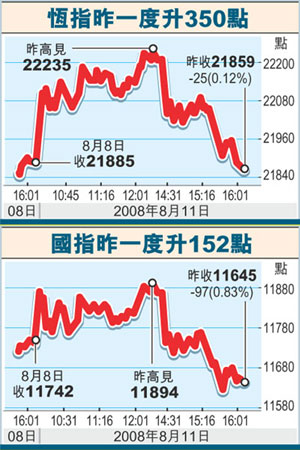 中新網(wǎng)8月12日電 據(jù)香港文匯報(bào)報(bào)道,受隔夜美股造好及內(nèi)地股市大挫影響,港股11日先升后跌,大市開(kāi)市高開(kāi)135點(diǎn),但午市受A股大跌逾5%影響,收市倒跌25.87點(diǎn),收?qǐng)?bào)21859.34點(diǎn),成交總額僅575.90億元。市場(chǎng)人士指,市場(chǎng)關(guān)注內(nèi)地的通脹數(shù)據(jù),港股后市料反復(fù),恒指或下試21500點(diǎn)。