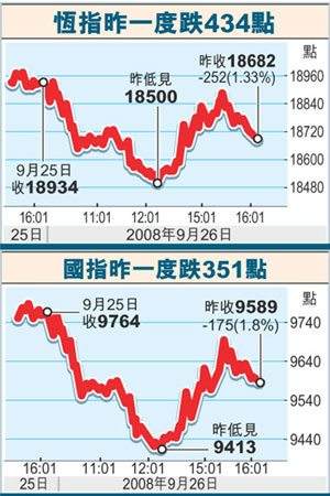 富昌證券總經(jīng)理藺常念表示,美國(guó)仍未通過救市方案,中移動(dòng)母公司又被國(guó)資委抽走500億元人民幣,令市場(chǎng)失去信心,令中移動(dòng)26日急跌3%。他形容,投資者目前對(duì)后市悲觀,紛紛不計(jì)價(jià)格地出貨套現(xiàn),就算內(nèi)地股市跌勢(shì)喘定,但美股走勢(shì)疲弱下,港股后市絕不樂觀,所以他預(yù)計(jì),大市下周將逐步回落至18000點(diǎn)水平。