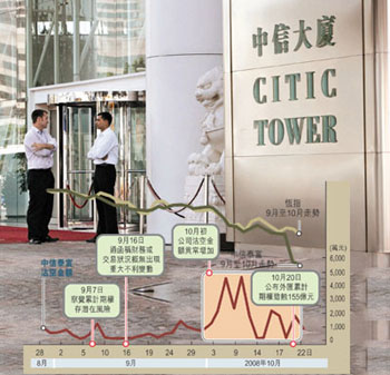 中信泰富股價(jià)繼21日急挫55%后,22日再挫逾24%。(圖片來(lái)源:文匯報(bào))