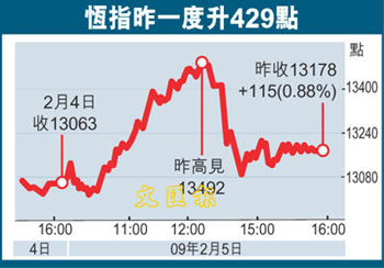 中新網(wǎng)2月6日電 據(jù)香港《文匯報(bào)》報(bào)道,雖然周三美股跌121點(diǎn),但港股5日在中資股,特別是中資金融股的推動(dòng)下,曾升429點(diǎn),收?qǐng)?bào)13178點(diǎn),升115點(diǎn)或0.88%,成交額較4日激增近50%至528.32億元,為今年1月中以來(lái)最多。