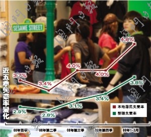 中新網(wǎng)5月5日電 《澳門日報(bào)》今日在頭條刊發(fā)報(bào)道稱,金融海嘯對澳門就業(yè)市場的沖擊漸顯。統(tǒng)計(jì)局?jǐn)?shù)據(jù)顯示,最新一期就業(yè)調(diào)查(今年1至3月)的失業(yè)率較上期(2008年12月至今年2月)上升0.2%,達(dá)3.8%,重上2006年中水平,就業(yè)不足率上升0.1%,達(dá)至1.8%。