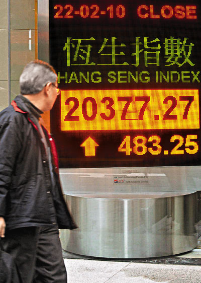 中新網(wǎng)2月23日電 據(jù)香港《文匯報》報道,內(nèi)地股市長假期后重開,A股走勢偏軟,滬深兩市均未能收紅盤。由于香港上周五已經(jīng)大跌,加上下午賣地成績理想,令恒指22日擺脫A股的羈絆,大市在匯控、中移動及一眾地產(chǎn)股上升帶動下,重上20000點水平。