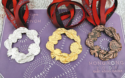 獎(jiǎng)牌的9片花葉分別有香港的洋紫荊、中國(guó)的牡丹、日本的櫻花、韓國(guó)的木槿、中華臺(tái)北的梅花、澳門的荷花、蒙古的睡蓮、朝鮮的木蘭及關(guān)島的杜鵑。