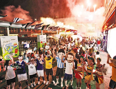 中新網(wǎng)6月12日電 “開波了﹗”香港球迷引頸待盼4年的世界杯昨晚正式揭幕,全城“熱爆”,熱舞狂歡處處,儼如嘉年華,商場、酒吧以至餐廳食肆變身“球迷樂園”,不分男女,不論是哪一隊的球迷,觀眾情緒同樣高漲,氣氛熱鬧。未來一個月,無論你是否球迷,相信也無法抵擋這股熱潮。