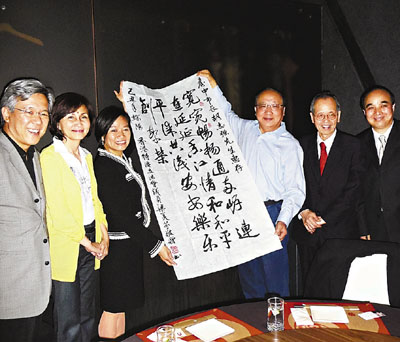 會上,梁美芬送了一幅字畫給胡志強作見面禮,上面寫有她創(chuàng)作的一首賦:“寬寬暢暢通海峽、連連延延香江情、和和平平謀共識、安安樂樂創(chuàng)繁榮”。胡志強也禮尚往來,充分發(fā)揮其幽默本色,說“從政就是要所有人快樂”。