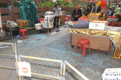 中新網(wǎng)3月15日電 據(jù)香港《大公報(bào)》報(bào)道,香港柴灣道一間水果攤因拒交“陀地”費(fèi)5年來頻被黑幫滋擾,患癌店東受刺激致病情惡化去世,遺孀和兩子接手后滋擾仍未間斷,14日晨店鋪開業(yè)時,被兩名惡漢突然走近潑淋藍(lán)色油漆,少東走避不及輕微濺中,另一名街坊婆婆經(jīng)過也中招,幸有驚無險(xiǎn)。