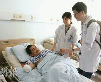臥在病床上的賈大夫,破爛的腸臟已縫補(bǔ)好,情況穩(wěn)定過來,但因雙臂和盆骨都折斷,動也不能動,深切體會能醫(yī)不自醫(yī)的無奈。他坦言,若不是身受創(chuàng)傷,他應(yīng)是在災(zāi)場上救援的一員,但目前只能等待由香港到來的醫(yī)生為他動手術(shù)!罢娴暮芨兄x香港醫(yī)生愿意前來幫忙……很有心……”