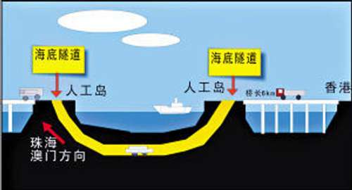 據(jù)大橋工程可行性研究總報告顯示,大橋主體工程長約35公里,擬定采用橋隧結(jié)合方案,其中位于伶仃西航道和銅鼓航道之間的海底隧道長6.75公里,隧道與橋梁相接處各修兩個橫截面長1公里的人工島;隧道造價約211億元人民幣,占到大橋主體工程預算投資額的近一半,其最深處離海平面40米左右,將確保30萬噸級油輪和15萬噸級以上集裝箱順利通航。