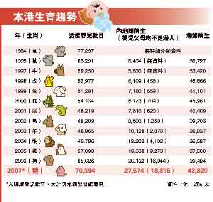 據(jù)香港明報(bào)報(bào)道,2007年醫(yī)管局共錄得39,182名新生嬰數(shù)字,醫(yī)管局總行政經(jīng)理鄭信恩說(shuō),雖然傳統(tǒng)上生仔旺季一向在9月至11月,但今年首個(gè)半月公立醫(yī)院生產(chǎn)個(gè)案,已明顯較去年同期上升,“去年經(jīng)濟(jì)好,市民積極想生育多點(diǎn),估計(jì)今年生育也會(huì)多,新生嬰應(yīng)會(huì)超過(guò)去年。”