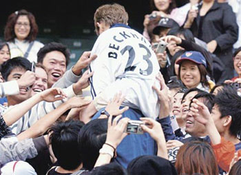在上海站拉傷右腿的貝克漢姆9日仍以正選上陣,踢足90分鐘,包辦所有角球及罰球,也不時在右路施展“七旋斬”威力,每逢貝克漢姆一拿球,即引來球迷狂呼,有的更大喊“David!David!”。