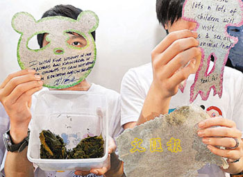 香港海洋公園學(xué)院學(xué)員展示用“盈盈”和“樂樂”的糞便制造的環(huán)保紙。(圖片來源:文匯報)