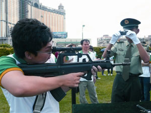 圖:學(xué)生手持自動步槍照相。(圖片來源:澳門日報)